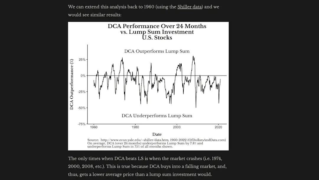(DCA就是平均投入,這張圖上是分成24個月進行,lump sum則是一次投入,圖上顯示的是DCA的績效減去lump sum的績效,若為正值,就表示「平均投資」的績效比「現在買」好。)