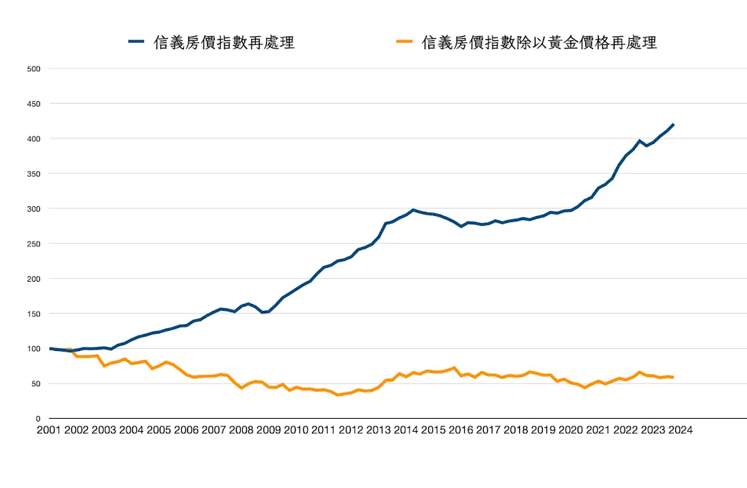 從2001年到2023年,短短22年間,信義房價指數成長到420%,但如果改成以黃金計價的,房屋價值的趨勢基本也是平的。