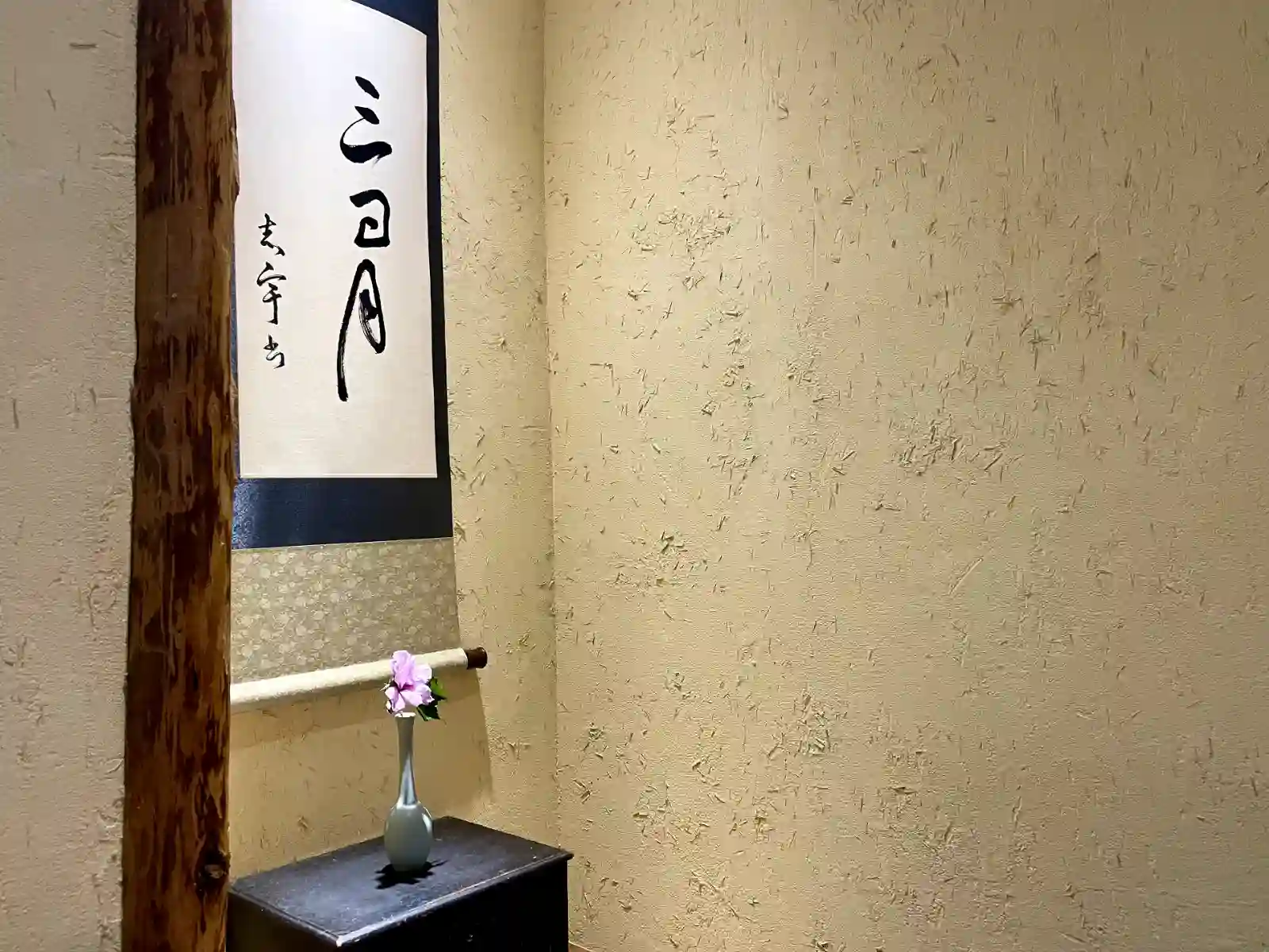 牆壁上掛著掛軸,屋外小庭院中也有洗手用的「蹲踞」,帶有一點日本茶室的氛圍。處處充滿著細節。